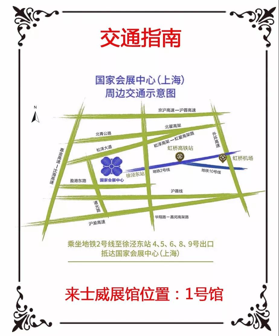 距虹橋機(jī)場1.5公里,距浦東國際機(jī)場約60公里,均可乘坐地鐵2號線至“徐涇東站”下車直達(dá)距上海虹橋火車站約1.5公里,可乘坐地鐵2號線至“徐涇東站”下車直達(dá)距上?;疖囌?5公里,距上海南站23公里,均可乘坐地鐵3號線至“中山公園站”換乘2號線至“徐涇東站”下車直達(dá)上海地鐵2號線徐涇東站4、5、6、8、9號出口可直通展館。