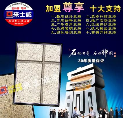 在來(lái)士威仿石漆展臺(tái),人氣高漲,前來(lái)觀摩產(chǎn)品、了解加盟政策咨詢的用戶絡(luò)繹不絕。展臺(tái)展示的系列仿石漆及藝術(shù)漆產(chǎn)品效果匠心獨(dú)具、完美詮釋了來(lái)士威仿石漆的獨(dú)特魅力!每個(gè)系列都有不同的風(fēng)采,獨(dú)特的韻味。集藝術(shù)、色彩、技術(shù)、環(huán)保與實(shí)用于一體。藝術(shù)感強(qiáng)、色彩絢麗、紋理層次多變、手感極為優(yōu)越。一經(jīng)展出,咨詢了解的人蜂擁而至。據(jù)介紹,目前來(lái)士威仿石漆推出的多項(xiàng)豐厚的加盟政策,可以幫助經(jīng)銷商輕松實(shí)現(xiàn)低風(fēng)險(xiǎn)、高收益的經(jīng)營(yíng)。對(duì)于希望創(chuàng)業(yè)或?qū)で笫聵I(yè)發(fā)展突破的人士來(lái)說(shuō),來(lái)士威仿石漆是一個(gè)理想的選擇。