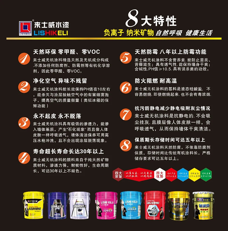 主要功能: 釋放負氧離子. 納米礦物抗菌抑菌. 調節(jié)濕度防霉自潔.治理甲醛凈化空氣. 消除靜電吸音降噪. 反射隔熱防火阻燃.